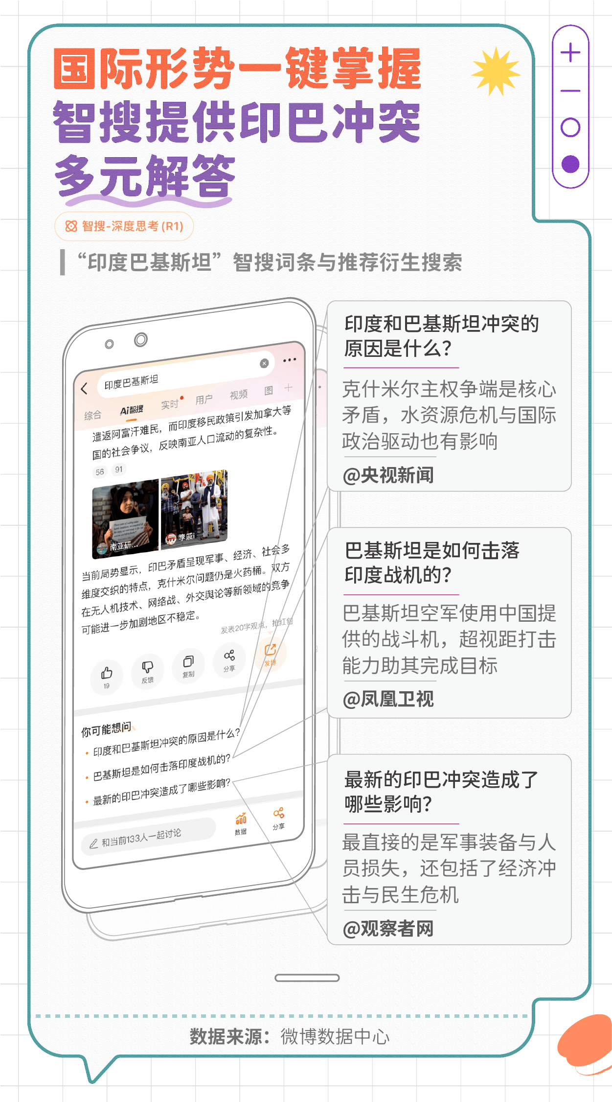 “印度巴基斯坦”冲突同样是近期邦际时事的热门。正在印巴冲突事故中,智搜以拓展问答局面层层深切,逐渐指示用户餍足其众元的新闻获取需求。缠绕“印度和巴基斯坦冲突的源由是什么”“巴基斯坦是何如击落印度战机的”“最新的印巴冲突变成了哪些影响?”等用户或许亲切的拓展题目,整合来自@央视消息、@凤凰卫视、@巡视者网 等媒体的解读资料,闪现整体新闻。