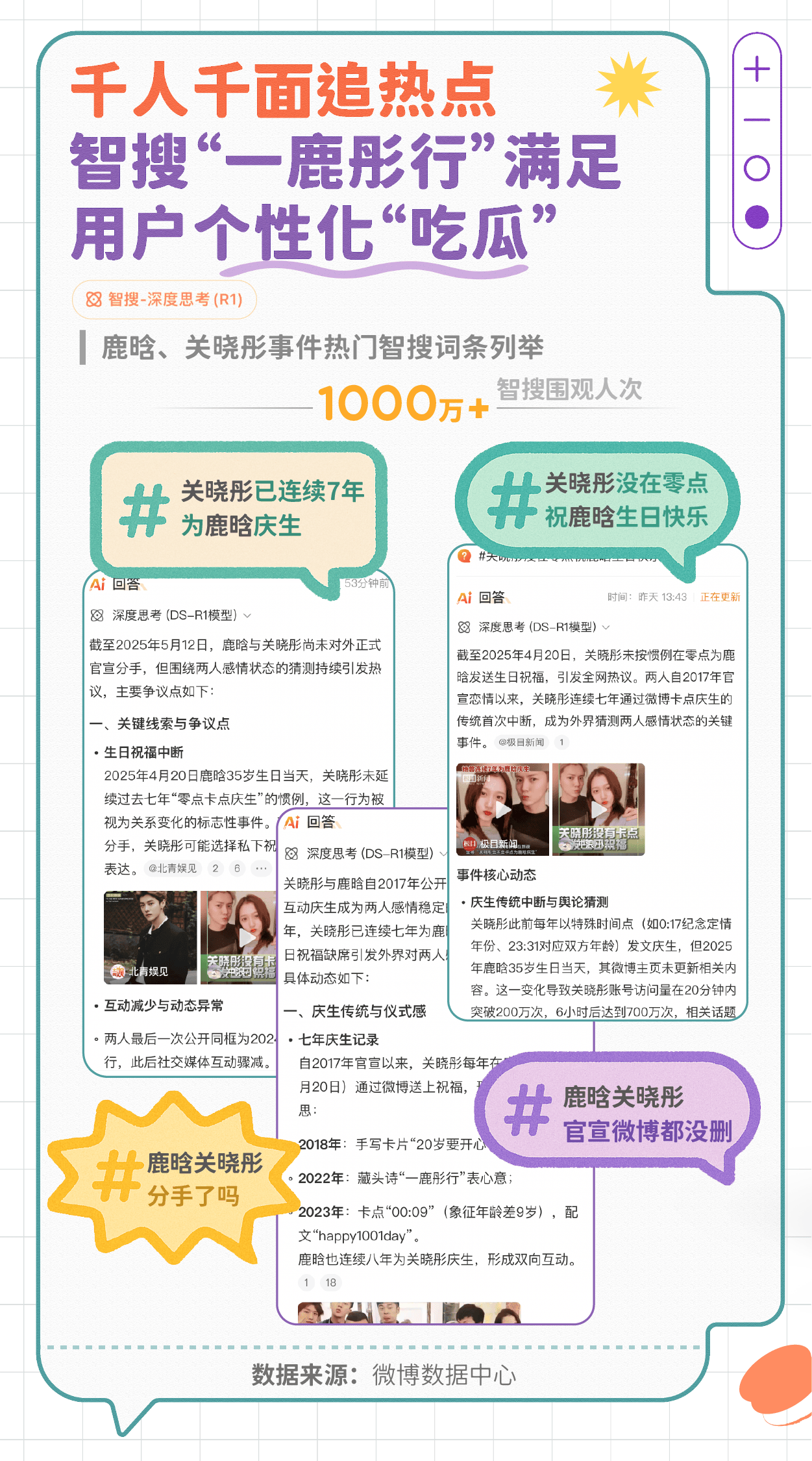 简直来看,通过智搜,用户的“吃瓜”实质消费变得体例化、脾气化。“闭晓彤已连气儿7年为鹿晗庆生”“鹿晗闭晓彤官宣微博都没删”“闭晓彤没正在零点祝鹿晗诞辰愉速”等热门商讨点被智搜先后捉拿,从而汇总结果,造成更立体的事故认知。