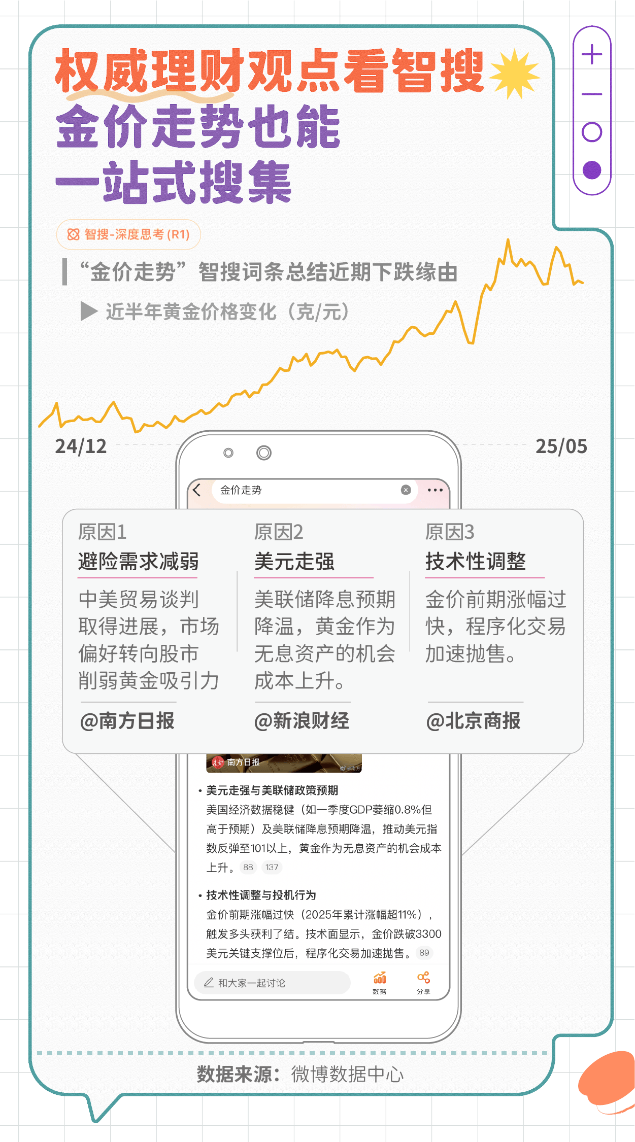 邦际时事瞬息万变,“金价走势”也广受影响。整合理财巨擘信源看法,智搜通过不绝跳升的趋向图,枚举了金价摇动的三大苛重源由:避险需求削弱、美元走强以及本领性调理。个中,来自@南方日报、@新浪财经、@北京商报 等主流媒体的剖析。通过将理财资讯一站式汇集功用,智搜可能有用助助用户正在纷乱众变的金融市集中操纵投资偏向,规避危害。