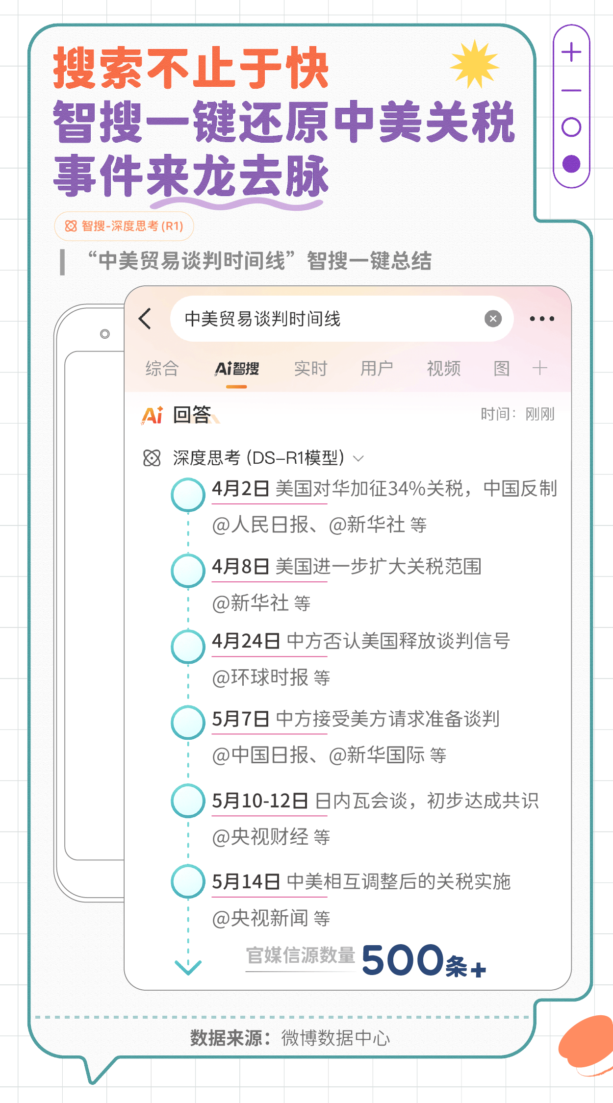 邦际时事瞬息万变,微博智搜为网友供给一站式环球视野。宏大时事热门中,“对美全体进口商品加征125%闭税”登顶2025年上半年微博智搜热度榜单,是邦际商业议题主旨。而智搜材干不止于速,而是一键还原了中美闭税事故的前因后果。从4月2日美邦对华加征340%闭税、中邦反制,到5月14日中美商业讲和后的新闭税奉行,智搜援用超500条来自@黎民日报、@新华社 等巨擘媒体的报道,用工夫线闪现事故脉络。