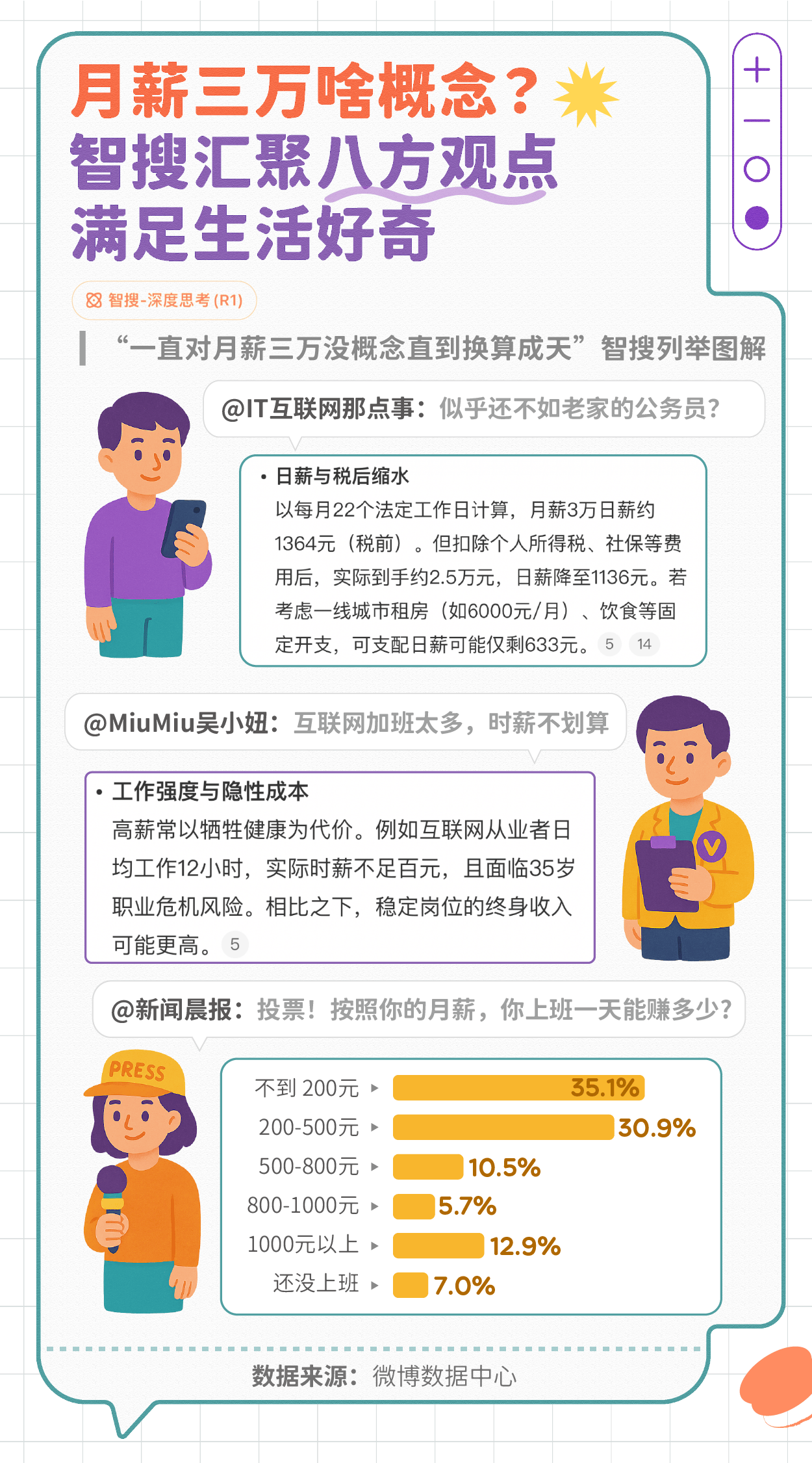 聊到钱,“无间对月薪三万没观点直到换算终日”也是智搜中的另一热门。行业大V、平凡用户、消息媒体各抒己睹,“辛劳”的智搜会聚八方看法,餍足用户对相互收入的好奇。智搜结果显示,日薪与税后收入的浩大差异令网友感伤“税负好重”,IT互联网从业者的长工时与高收入并存的近况,也吸引人们商讨其与体系内任务的性价比来。而遵循@消息晨报 的微博考查,超35%的网友日薪亏空200元,日薪500元以上者仅为少数。