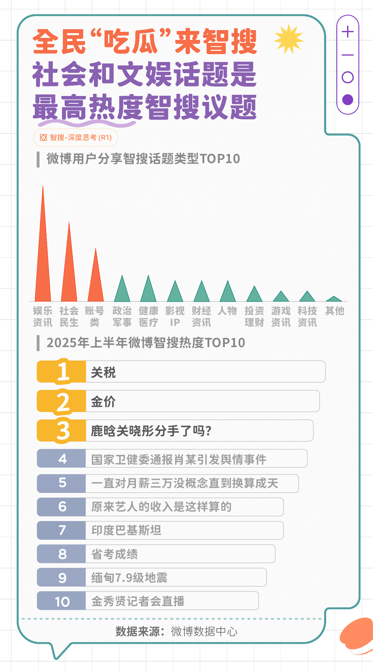 文娱“吃瓜”,更是智搜材干的“安适区”。告诉密现,微博网友分享的智搜线中,文娱与社会民生资讯是用户最爱看的实质,远超军事、康健、影视、体育等其他话题类型。通过剖析切切级微博话题商讨,智搜能迅疾抓取并汇总各方看法,闪现出完美的“吃瓜全景图景”。智搜热度榜单中,“鹿晗闭晓彤形离婚了吗?”成为2025年上半年微博智搜热度TOP3,激励超1000万人次智搜盘查。