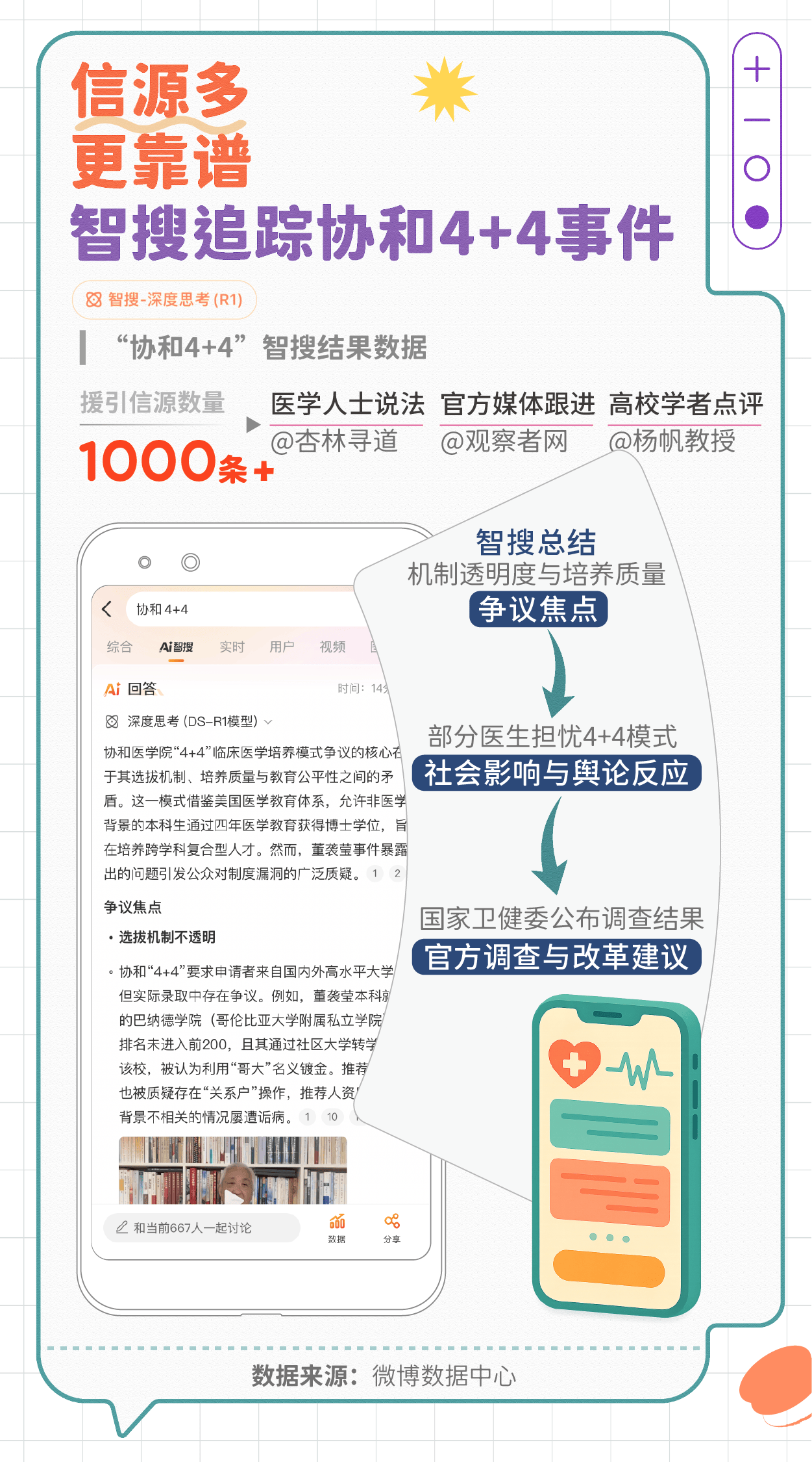 医疗话题动作持久热门,也正在本年上半年激起了用户对智搜的深度行使。4月下旬,中日友情病院肖某舆情事故及大众对协和“4+4”作育项宗旨质疑,让“协和4+4”成为智搜热门词条。通过整合超1000条医学人士说法、官方媒体跟进以及高校学者点评动作信源。智搜用显露的逻辑框架,将争议主旨概括为“机制透后度与作育质地”“社会影响与舆情响应”以及“官方考查与转变倡导”三大维度,行使户或许正在短工夫内操纵事故主题,思虑各方看法,实时获取官方考查结论。